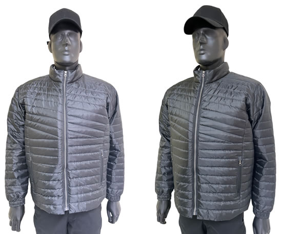 Chamarra antibala tipo enguatada de corte europeo con paneles balísticos de polietileno de alta densidad o de aramida unidireccional encapsulados en un forro 100% impermeable sellados por equipo de ultrasonido.